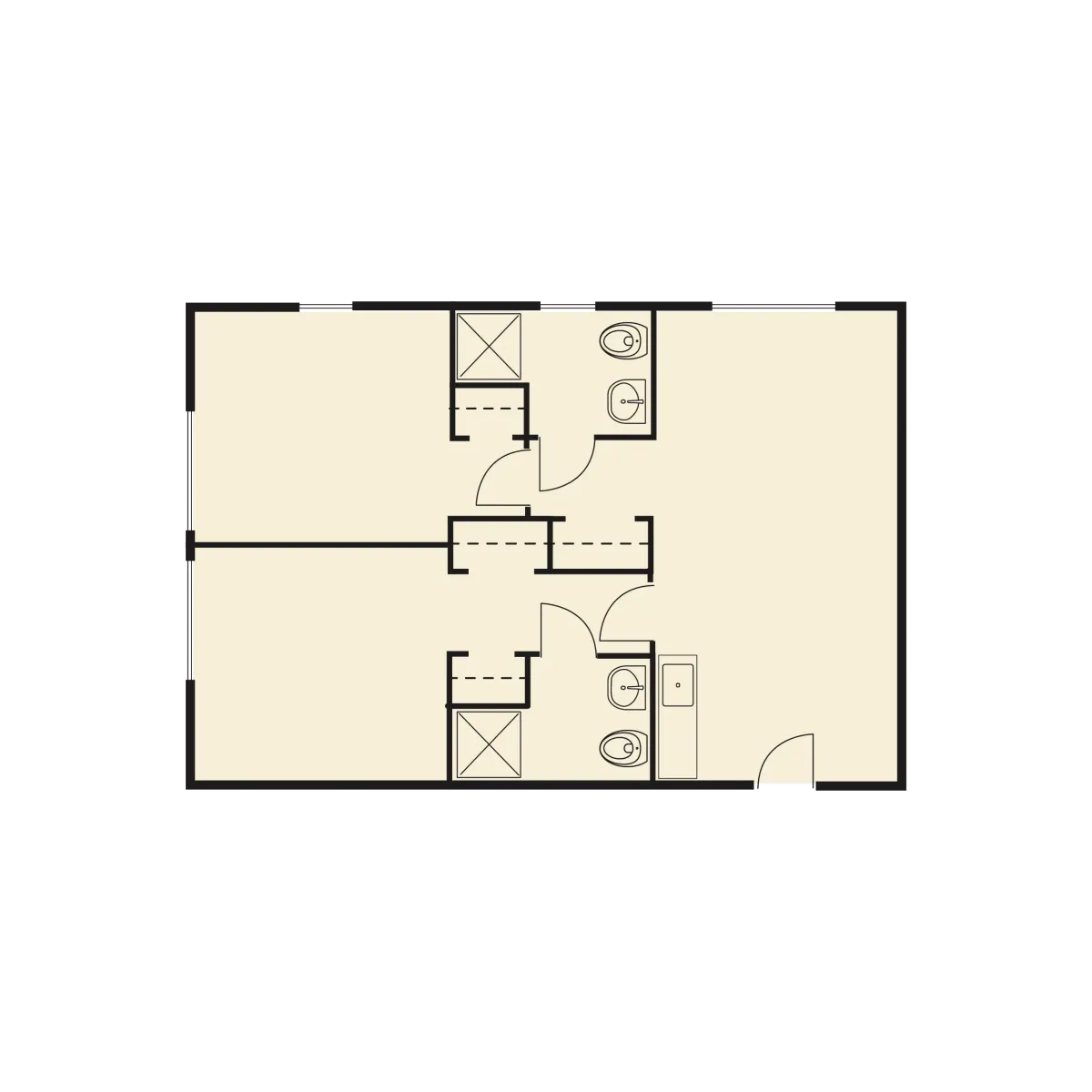 A two-bedroom layout designed for companions or extra space, with privacy and shared living areas.